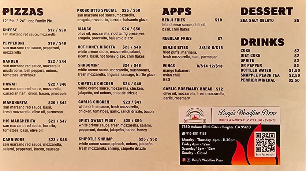 Benji’s Woodfire Pizza, currently closed, offers a diverse menu, including appetizers like Garlic Rosemary Cheese Bread and Benji Bites, along with a variety of delectable pizzas such as the Carnivore and Bianco. Customer reviews rave about the friendly service and high-quality ingredients used in their pizzas. With a cozy atmosphere and a unique blend of flavors from their woodfire oven, Benji’s stands out as a must-visit spot for pizza lovers. The menu also includes a selection of drinks to complement your meal. Despite being temporarily closed, Benji’s Woodfire Pizza has left a lasting impression on customers, making it a standout in the Citrus Heights area.